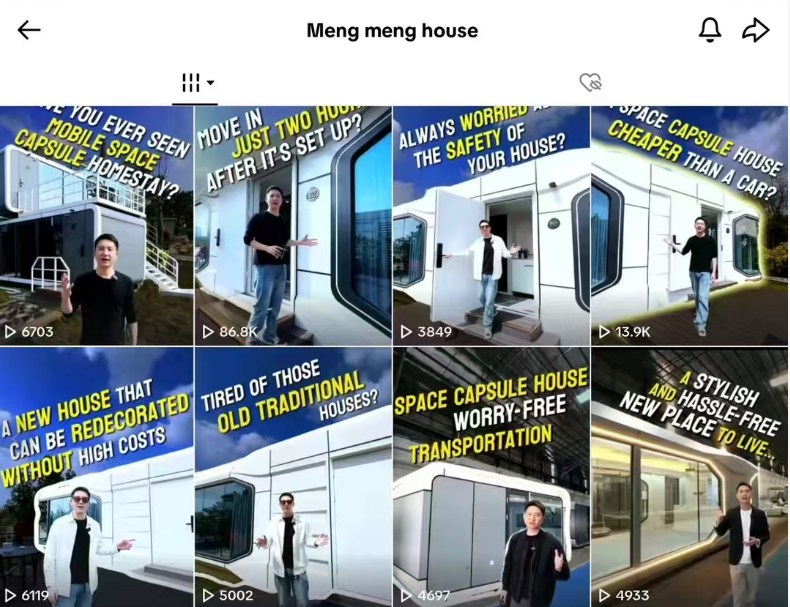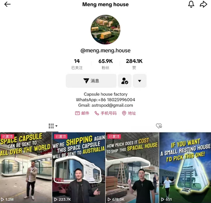 相比阿里巴巴国际站等以图文为主的平台,TikTok的视频形式能更立体地展现太空舱的科技感、功能性与设计美学,降低客户的理解成本。